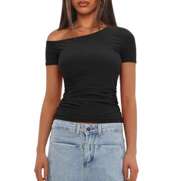 Darong Women's Double Lined Slim Fit Tshirt One Shoulder Short Sleeve Ruched Crop Top Fashion Outfit Clothes