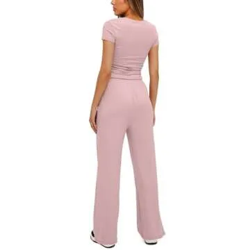 Darong Women's Short Sleeve Ruched Tee and Wide Leg Pant 2 Piece Tracksuit Sleep Pajama Set 9042A Dark Pink M