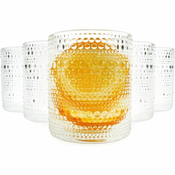 The glasses boast an elegant transparent look that is complemented by their Victorian-era beaded hobnail surface, providing not only beauty but also a comfortable grip. They can also double as votive candle holders or decorative items to enhance the ambiance of a room, demonstrating their versatility beyond beverage service.