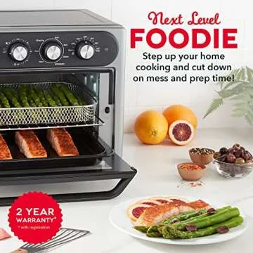 Show more The Dash Chef Series 7-in-1 Convection Toaster Oven Cooker is a culinary marvel that redefines home cooking. With its unique blend of versatility and efficiency, this appliance truly shines in every kitchen. Imagine having one single appliance that can Air Fry, Bake, Broil, Toast, Convection Bake, Rotisserie, and Warm your favorite dishes—all while occupying minimal space on your countertop. The stunning Stainless Steel and Graphite finishes don’t just look elegant; they also promise durability and easy maintenance.