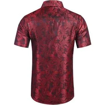 Daupanzees Mens Regular Fit Short Sleeve Shiny Silk Like Satin Dance Prom Luxury Dress Shirt Jacquard Shirt Tops (Red XL)
