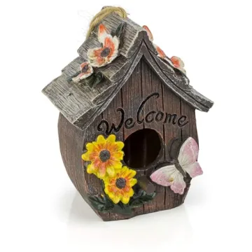Show moreAdd a touch of charm and whimsy to your outdoor space with the Dawhud Direct Hanging Bird House. This beautifully hand-painted birdhouse showcases a delightful Butterfly and Flowers Welcome design that will not only provide a cozy shelter for your feathered friends but also serve as an enchanting decorative element for your garden, deck, or patio. Crafted from high-quality, durable polyresin, this birdhouse is built to withstand the elements while keeping its vibrant colors intact. At an ideal size of 6 inches high and 7 inches wide, it hangs effortlessly from any outdoor setting and comes fully assembled, so you can enjoy it right out of the box.