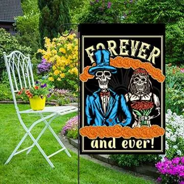Embrace the spirit of Día de Los Muertos with our stunning Day of the Dead Garden Flag from the renowned brand Forever and Ever. This beautifully crafted flag is not just a decoration; it’s a vibrant piece of art that adds a festive touch to any outdoor space. Measuring 18 x 12 inches, this flag features a captivating double-sided design showcasing a skeleton bride and groom alongside colorful marigold flowers. Crafted from durable polyester fabric, it ensures that your...