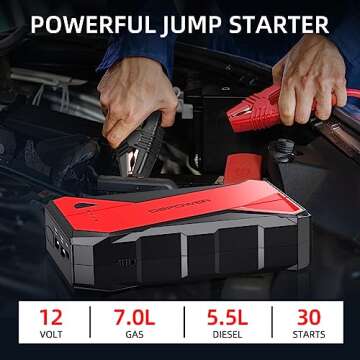 Show more Introducing the revolutionary DBPower Jump Starter, a game-changing device for vehicle owners everywhere! This upgraded model boasts a powerful 1000A peak current, allowing it to effortlessly start gas engines up to 7.0L and diesel engines up to 5.5L. Whether you’re dealing with cars, SUVs, motorcycles, lawn mowers, or trucks, this device meets all your jump-starting needs. The standout feature of this jump starter is its LCD screen with a built-in voltmeter, letting you check the battery strength at a glance, even without plugging it in.