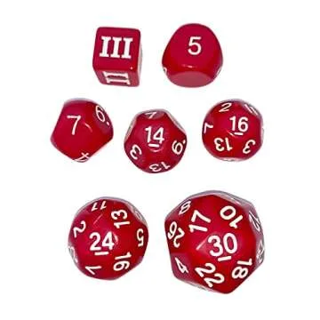 Show moreUnleash your creativity and enhance your gaming experience with the DCC Special 7 - Red - Set of 7 Rare and Unusual RPG Dice. This unique collection features a D3, D5, D7, D14, D16, D24, and D30, each meticulously designed for precision and performance in all your tabletop RPG adventures. Crafted to be both visually stunning and functionally superb, these dice are not only aesthetically pleasing but also expertly tested to ensure fair and equal probabilities during gameplay.