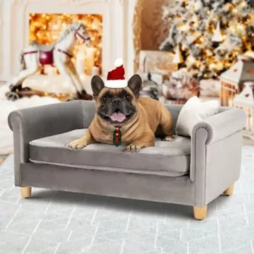 The dog sofa is made from premium velvet fabric with a sturdy wood frame.