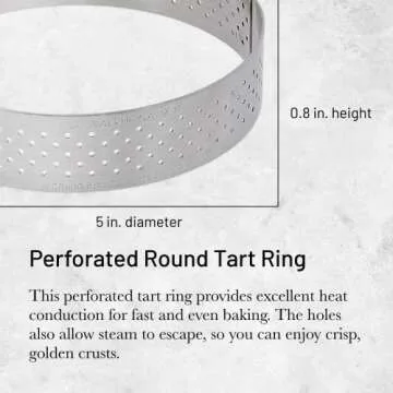 Show more Elevate your baking experience with the de Buyer Perforated Round Tart Ring, a premium kitchen tool expertly designed in collaboration with the prestigious l'Ecole du Grand Chocolat Valrhona. This 5" diameter tart ring is your ticket to mastering French pastry traditions right at home. It features a unique perforated design that allows for optimal heat distribution, ensuring your pastries achieve that perfect golden-brown crust every single time. No more battling soggy bottoms; the expertly placed holes promote steam escape so you can enjoy flawlessly crisp tarts that will delight your taste buds.