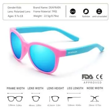 DEAFRAIN Kids Sunglasses are the perfect accessory for your child, blending safety and style in one lightweight package. Designed specifically for children aged 5-13, these sunglasses feature a flexible, food-grade TPEE frame that is not only bendable but virtually unbreakable, ensuring that your kids can enjoy their outdoor activities without the worry of breaking their sunglasses. Weighing only 22.5g, they are ultra-light, so your child will hardly notice they're wearing...