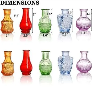 Show moreIntroducing the **DEAYOU 10-Pack Glass Bud Vases** – a stunning collection of small vintage flower vases expertly crafted from crystal colored, sturdy thick pressed glass. Designed with an embossed patterned finished surface, these vases are not just beautiful but also durable, making them a perfect addition to any home. The reflective surface creates a mesmerizing display, allowing you to see the vibrant cuttings inside, while the textured design added shine and elegance to your floral arrangements. Ranging in height from **4.3" to 6"** and a base width of **1.6" to 2.5"**, these compact sizes and diverse antique shapes integrate seamlessly into various decor styles, ensuring they fit beautifully in any setting.