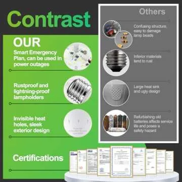 Show moreIntroducing the DEBAOBULB 10 Pack Rechargeable Emergency Light Bulbs, a revolutionary lighting solution designed to keep you illuminated during those unexpected moments of darkness. These dual-function bulbs operate just like a standard light bulb, providing a crisp, bright 6000K daylight LED output when powered. But what truly sets them apart is their uncanny ability to remain lit during a power outage or emergency. With their built-in rechargeable battery, these bulbs can last for up to 4-5 hours with continuous use when the power goes out, giving you peace of mind that you won't be left in the dark.