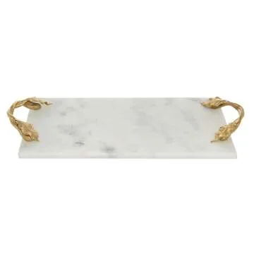 Deco 79 Large Rectangular White Marble Serving Tray with Golden Leaf Handles for Home Decor