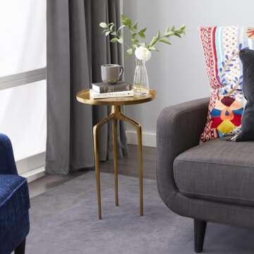 Show moreDiscover the Deco 79 Aluminum Metal Side End Accent Table, a true masterpiece of contemporary design that effortlessly combines functionality with artistic flair. This accent table, measuring an impressive 15.95L x 16W x 25.30H inches, showcases a striking gold finish that enhances any living room's aesthetic. Crafted from solid aluminum, it promises not only durability but also a stylish presence that complements modern interiors. The round tabletop features raised edges, ensuring that items placed on it remain secure, while the long curved tripod legs lend it a unique silhouette.