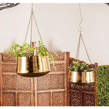 Show more Transform your living space with the Deco 79 Metal Indoor Outdoor Wall Planter, a stunning set of two exquisite hanging planters designed to elevate your home decor. Crafted from durable iron and featuring sleek metallic finishes, these hanging plant holders offer both functionality and elegance. Each planter boasts a stunning satin metallic gold finish that catches the light beautifully, making them the perfect choice for those looking to add a touch of glamour to their indoor or outdoor setup. With sturdy chains and solid construction, these pots are engineered not just for style but also for durability, promising to support your favorite greenery while enhancing the overall aesthetic of your space.