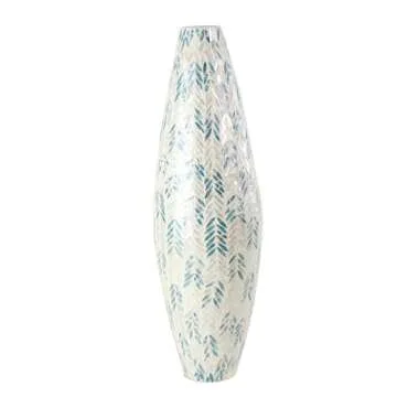 Show more Introducing the stunning Deco 79 Mother of Pearl Shell Handmade Decorative Vase, a breathtaking piece that transforms any living space into a serene coastal retreat. This tall mosaic centerpiece vase is inspired by the tranquil beauty of the sea, effortlessly adding charm and elegance to your home décor. Crafted from high-quality mother of pearl shell and bamboo, this exquisite vase measures 10.25 inches in length and width, and a towering 33.13 inches in height, making it a standout feature in any room. The polished cream finish intricately highlights swirling blue accents, creating a stunning visual impact while celebrating artisanal craftsmanship.
