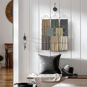 Show moreIntroducing the **Deco Brothers Scarf Hanger for Closet**, a beautifully crafted solution for organizing your scarves, belts, and ties. With **23 spacious storage compartments**, this elegant hanger is designed to accommodate a variety of accessories, effortlessly keeping your wardrobe uncluttered. Utilizing a sleek chrome finish, it combines style and functionality, making it a perfect fit for any contemporary closet. The ingenious design ensures easy access and painless storage for all your winter scarves, allowing you to showcase your collection without damage or hassle. Built from durable metal construction, this hanger is not only sturdy but also exhibits a touch of sophistication that enhances your closet space.