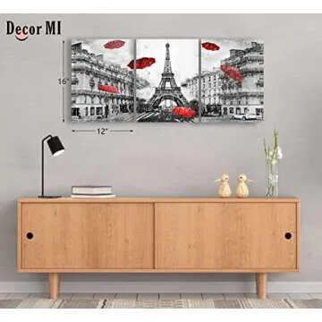 Decor MI Canvas Wall Art Paris Eiffel Tower Canvas Prints Wall Artwork Black and White Red Umbrellas Poster Print Painting Paris Decor for Living Room Girls Bedroom Kitchen Bathroom 12x16inch 3 Panels