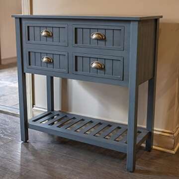 Show moreTransform your entryway or living room with the exquisite Decor Therapy Bailey Bead Board 4-Drawer Console Table. This stunning console table, finished in an appealing antique navy hue, is meticulously crafted from a combination of quality MDF and solid wood. Not only does it provide a charming statement piece for your home, but it also combines functionality with style. The console table measures 14 x 32 x 32 inches, making it an ideal space-saver while offering ample storage solutions.