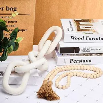 Show more Discover the charm and elegance of our exquisite wooden chain link and bead garland set, perfect for enhancing any home decor. Crafted by skilled artisans, this stunning white wooden chain link measures approximately 55 cm in length, featuring five intricately designed round buckles, each measuring 15 x 10 cm. Accompanying this beautiful chain, the set also includes a wood bead garland adorned with 85 meticulously hand-carved beads, extending a generous 148 cm with individual beads about 16 mm in diameter. This harmonious duo marries the beauty of nature with exquisite craftsmanship, setting the stage for a serene and rustic aesthetic.