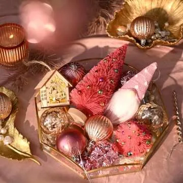 DecorbyHannah 70ct Christmas Ornaments Set, Shatterproof Decorative Pink Gold Christmas Tree Decorations with Small Xmas Tree, Gnome and Wooden Lighted Bird House for Home Party Halloween Decor