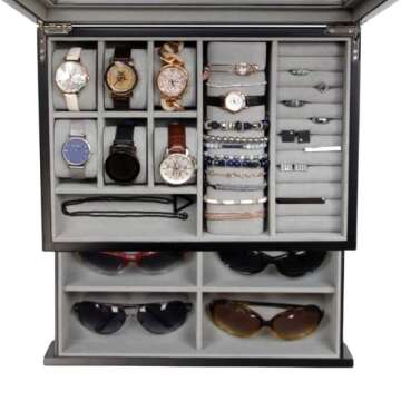 Decorebay Executive Unisex Black Wood Valet Sunglasses and Jewelry Box Storage Organizer