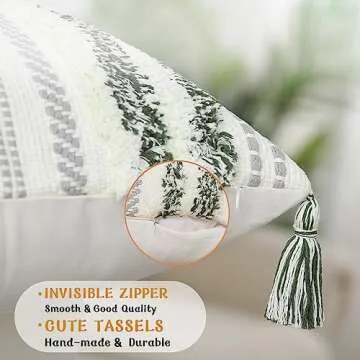 Show moreTransform your living space with the decorUhome Decorative Boho Throw Pillow Cover, a quintessential blend of style and comfort. Measuring a versatile 12x20 inches, this lumbar accent pillow cover is not just a home accessory; it is a statement piece that elevates any decor. Crafted with a unique multicolored design featuring a woven rope pattern and soft tufting, this pillow cover combines earthy shades of green and cream white to add warmth to your couch or bed. The creative incorporation of hand-made tassels adds a whimsical touch that is sure to charm your guests.