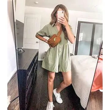 DEEP SELF Holiday One Piece V Neck Shorts Rompers and Jumpsuits for Women Casual Spring Button Down Collared Green Loungewear with Pockets