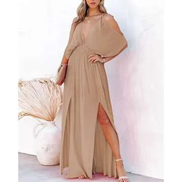 Show more The Cold Shoulder Maxi Dress is a stunning addition to any woman’s wardrobe, ideal for the sunny days of summer and spring. Crafted from 100% premium polyester, this dress flows elegantly while providing comfort and style. The dress features a beautiful cold shoulder design combined with a chic v-neck, halter neck, and exquisite split cutouts that exude sophistication and sensuality. Available in various sizes from S to XL, it accommodates different body types while ensuring the perfect fit. Depending on your size, the dress ranges in length from 54.72 inches to 55.91 inches, catering to both short and tall women.