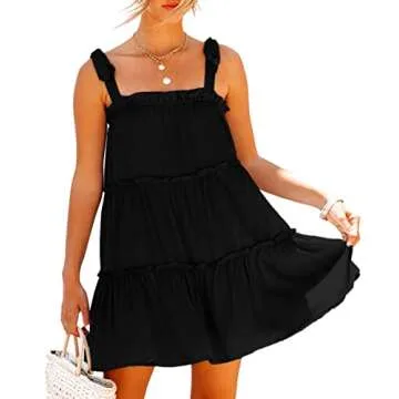 Deerose Womens Square Neck Sundress Sexy Ruffle Beach Tie Strap Summer Chiffon Tiered Coverup Dress Black M