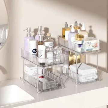 Delamu 2 Pack Bathroom Under Sink Organizers and Storage, Snap-Lock Pull Out Bathroom Medicine Cabinet Organizer,Multi-Purpose Kitchen Pantry Organizer and Storage with Movable Divider