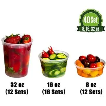 Show more Introducing the ultimate solution for food storage enthusiasts: our Deli Food Storage Containers! This innovative set features a remarkable selection of sizes: 32 oz (12 pack), 16 oz (16 pack), and 8 oz (12 pack), providing you with all the versatility you need for various meals and snacks. These containers are crafted from high-quality BPA-free plastic, ensuring your food is stored safely and securely. Whether you're preparing vibrant salads, delicious pastas, or scrumptious desserts, these containers are designed to withstand the rigors of daily use while keeping your food fresh for days.