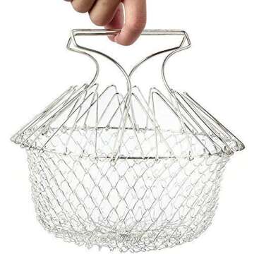 Delidge Foldable Stainless Steel Deep Fry Basket Multifunction Steam Rinse Strain Fry Strainer Net Telescopic Folding Basket Fry Basket for Fried Food or Fruits Kitchen Utensil Cooking Net Gadgets