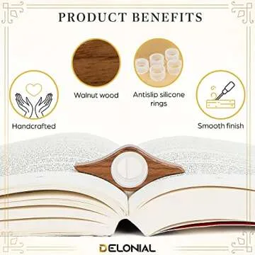 Show moreExperience the joy of reading like never before with the Delonial Book Page Holder, a revolutionary tool designed for book lovers who want to keep their pages open effortlessly. This innovative device allows you to read your favorite novels while conveniently using your free hand for a cup of coffee or jotting down notes. Crafted from high-quality wood, the page holder is not only durable but also adds a touch of elegance to your reading experience. It comes with five customizable silicone rings, ensuring a snug fit for any thumb size, so comfort is guaranteed.