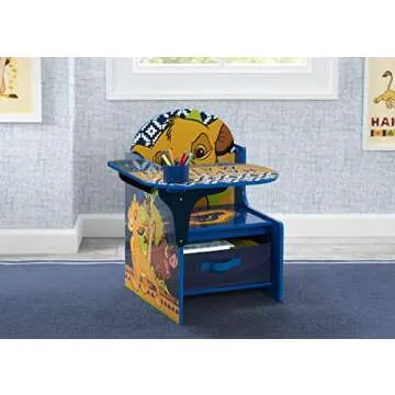 Show moreTransform playtime and learning into a magical experience with the Delta Children Chair Desk With Storage Bin, The Lion King. Designed specifically for little fans of the iconic Disney movie, this colorful chair desk combination is more than just furniture; it’s a ticket to imaginative adventures and educational fun. Crafted with high-quality, sturdy materials, this chair desk is not only durable but also safe for your child, providing a perfect spot for them to draw, color, or enjoy meals. With an attraction featuring beloved Lion King characters, it brings a sense of joy and excitement to their daily routine. It’s incredibly easy to assemble and tailored for kids aged three and above, making it a delightful addition to any playroom or learning space.