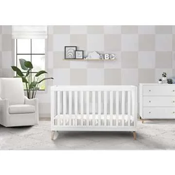 Delta Children Essex 4-in-1 Convertible Baby Crib, Bianca White with Natural Legs + Delta Children Twinkle Galaxy Dual Sided Recycled Fiber Core Crib and Toddler Mattress (Bundle)