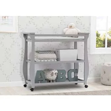 Show moreIntroducing the Delta Children Lancaster Changing Table with Wheels, a thoughtfully designed piece that seamlessly blends functionality with style. Crafted by the esteemed Delta Children, this changing table stands out for its expert engineering and versatility. With its sleek contemporary design in a beautiful Grey finish and equipped with four sturdy wheels, it's perfect for parents who appreciate both mobility and elegance in their baby's nursery. The 39.75" W x 21.50" D x 36" H dimensions offer ample surface area for all your changing needs while ensuring easy accessibility to essentials stored on its spacious two shelves.