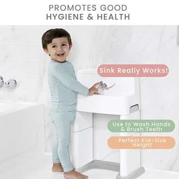 Show more The Delta Children PerfectSize 3-in-1 Convertible Sink is a revolutionary addition for every little one's self-care routine. Engineered for toddlers, this innovative sink not only provides a space for washing hands and brushing teeth but also converts into a sturdy step stool and bath toy. Suitable for ages 1 and up, it’s a delightful way to encourage children to develop healthy hygiene habits while making a splash in their daily routines. Its natural white and grey color scheme seamlessly blends into any bathroom decor, making it both functional and stylish.