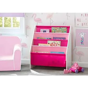 Delta Children Sling Rack Bookshelf for Kids - Easy-to-Reach Storage for Magazines or Coloring Books - Ideal for Playrooms & Homeschooling - Greenguard Gold Certified, White/Pink