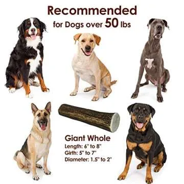Show more Discover the joy of giving with the Deluxe Naturals Elk Antlers for Dogs, an exceptional chew that is guaranteed to captivate your canine companion. Each giant whole elk antler is specially designed for larger breeds over 50 pounds, including popular selections like the Labrador Retriever, Pit Bull Terrier, German Shepherd, and Great Dane. These premium-grade A elk antlers are carefully collected from naturally shed antlers, ensuring no harm comes to any animal.