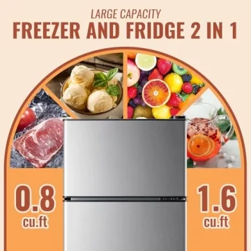 Show more Meet the DEMULLER 2.4 Cu.ft Mini Fridge, your ultimate space-saving solution for all your refrigeration needs! Designed with a sleek silver finish, this double-door personal fridge not only enhances the aesthetics of your room, but also offers enhanced functionality. With an impressive capacity of 2.4 cubic feet, it provides a well-sized freezer area of 0.8 Cu.ft for storing ice cream and frozen goodies, while the 1.6 Cu.ft refrigerator area is perfect for drinks, fruits, and vegetables. Perfectly suited for small spaces, this compact fridge measures just 15 x 14.6 x 30.8 inches, allowing you to maximize your area without compromising on storage.