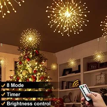 Show more Illuminate your space with the enchanting glow of our innovative Firework LED String Lights. Featuring 200 vibrant warm white LEDs on 50 branches of flexible copper wiring, these lights bring a sparkling ambiance to any setting. Whether you're decorating your home, porch, or garden, their versatility makes them suitable for a multitude of occasions. Designed with 8 different lighting modes, you can easily switch from a soft twinkle to a steady glow all from the convenience of a remote control that works up to 15 meters away.