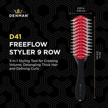 Show moreIntroducing the Denman Free Flow Wide Spaced Pins 9 Row Hair Styling Brush, the ultimate grooming companion tailored for those with curly and textured hair! This exceptional brush isn't just an accessory; it's a revolutionary tool designed to transform your hair care routine. Whether you're someone who cherishes lavish curls or seeks to manage dense, textured locks, this Denman brush is engineered to deliver salon-quality results from the comfort of your home. Featuring a sophisticated design with 9 staggered rows of sculpted, round-ended nylon pins, each stroke becomes a joyous affair, making detangling and styling a breeze.