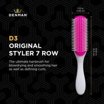 Show more The Perfect Curls: The Original Curl Definer & Styler Hairbrush is an essential tool for anyone with naturally curly hair. Designed by the renowned brand Denman, this innovative hairbrush is crafted specifically to help you style, shape, and define your curls beautifully. The secret lies in its unique design featuring 7 rows of sculpted round-ended nylon pins that provide denser movement and definition to your curls, making styling a dream.