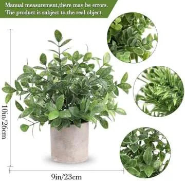 Show moreAdd a touch of nature to your space with these exquisite faux plants designed to enhance your decor effortlessly. Our mini potted artificial plants measure approximately 9.5 inches tall, making them an ideal addition to any nook or cranny in your home or office. The pots are made of sturdy paper pulp and measure about 3.65 inches wide, giving them a rustic charm. Crafted from high-quality plastic, the eucalyptus leaves replicate the delicate appearance of real foliage without the fuss of nurturing them.