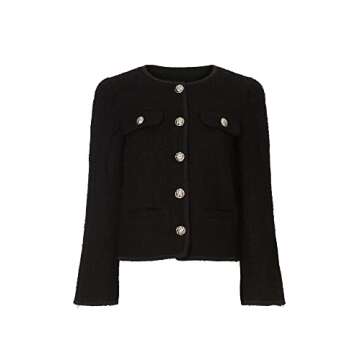 Show moreDiscover the perfect blend of sophistication and casual elegance with the Derek Lam Collective RTR Design Collective Tweed Blazer. Crafted from a luxurious blend of 50% Acrylic, 30% Polyester, and 20% Wool, this black tweed blazer is designed for the modern individual who seeks both style and comfort. With its long sleeves and crewneck design, this blazer is versatile enough to transition from day to night. The front button closure adds a touch of classic flair, while the 21.5" length from shoulder to hemline is perfectly tailored to flatter a variety of body types, making it a staple in any wardrobe.