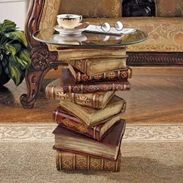 Show moreIntroducing the Design Toscano Power of Books Vintage Decor Stacked Books End Table: a delightful fusion of function and artistic expression tailored for bibliophiles and literary aficionados alike. This stunning end table, hand-crafted with a unique cast stone resin, captures the charming allure of stacked vintage books, reminiscent of the cozy atmosphere found in classic English libraries. The faux brass details on the spine and rich texture mimic worn leather, creating a piece that not only serves as a décor item but also as a conversation starter in any room. With its generous 21-inch height and 16-inch diameter round pencil-edged glass top, this table effortlessly combines style with practicality, providing a cozy space to place your favorite novels, morning coffee, or cherished decor items. Enhance your living space with a touch of whimsy and nostalgia that reflects your love for literature and aesthetics.