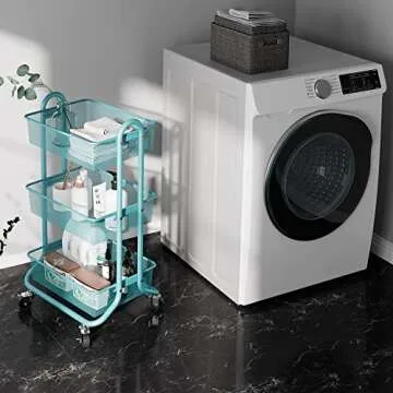 DESIGNA Metal Utility Cart, 3 Tier Mesh Rolling Storage Cart with Handle and Lockable Wheels,Easy Assembly Craft Carts for Kitchen,Bathroom,Office,Turquoise