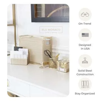 Show more The captivating Gold Desk Accessories Set from Blu Monaco is a must-have for anyone looking to combine functionality with a touch of glamour in their workspace. This five-piece set includes everything you need to keep your desk organized and stylish. Featuring a letter-size hanging file folder organizer, a magazine file holder, a pen cup, a sticky note holder, and a small file organizer, this set promises both exquisite aesthetics and practical utility.