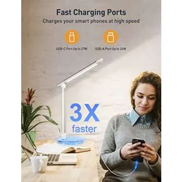 Show moreIlluminate your space with unmatched versatility using the Dimmable Desk Lamp. This modern LED lamp is meticulously designed to cater to your every lighting need, whether it be for reading, crafting, or creating art. It features a small footprint that allows it to fit seamlessly in any area, yet packs powerful functionality. Equipped with 27W USB charging ports, it provides fast charging capabilities that can energize your iPhone 13 or iPhone 14 from 0% to 50% in just 25 minutes, helping you stay connected while working. You can effortlessly charge two devices simultaneously while enjoying your workspace. The lamp also boasts a touch control feature, allowing you to switch between 10 brightness levels and 5 color temperature settings, perfectly matching your environment and enhancing your productivity.