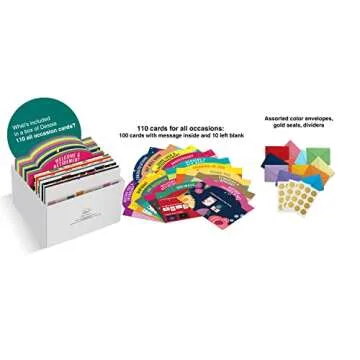 Show more Experience the joy of timeless connections with the Dessie 110 Unique All Occasion Card Assortment. This stunning collection features 110 different, high-quality greeting cards designed to cater to every possible moment of celebration, from birthdays to anniversaries to heartfelt messages of sympathy. Each card in this assortment is a unique masterpiece, ensuring that you always have the perfect sentiment on hand for any occasion. Unlike conventional greeting cards that often have duplicates, you can count on this meticulously crafted selection of cards to exceed your expectations, presenting varied expressions of love, encouragement, and support.
