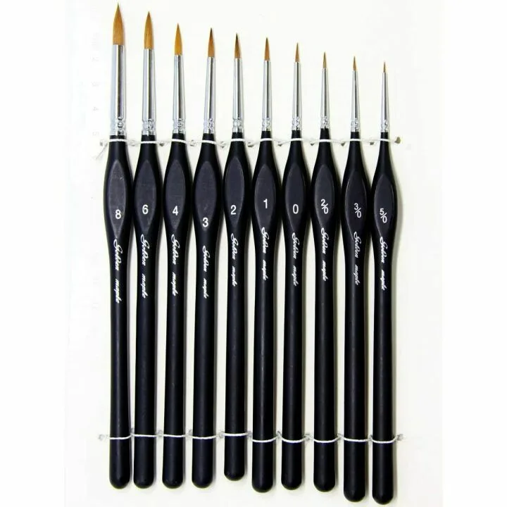 The set includes 10 brushes in sizes: 5/0, 3/0, 2/0, 0, 1, 2, 3, 4, 6, and 8.
